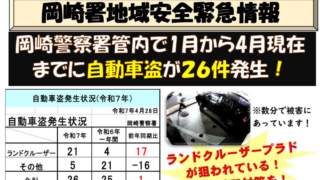 愛知県警察:パトネットあいちより◎岡崎市内で車上ねらい等が連続発生!■状況2月1日(日)から翌朝にかけて、岡崎市矢作町、宇頭町及び暮戸町地内アパート駐車場等において、車の窓ガラスを割られ車内を物色される等の被害が5件連続発生しました。■対策...